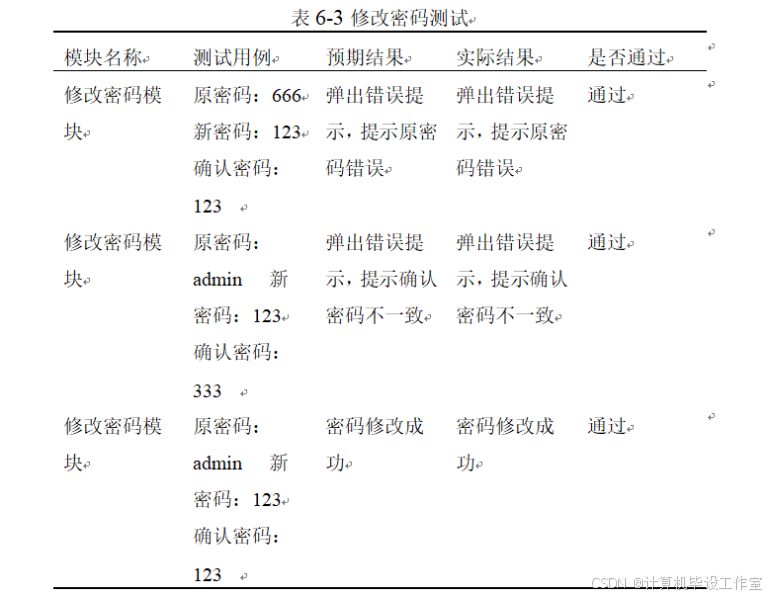 (3)修改密码测试。在修改密码模块,通过二个用户的修改数据进行该功能的测试。测试中发现只有第三次的修改密码成功了,第一次和第二次的密码修改出现了问题。问题的原因分别为“密码错误”和“确认密码不一致”的问题。通过多次的修改和测试,发现修改密码这一功能运行正常,没有问题。如表6-3所示。