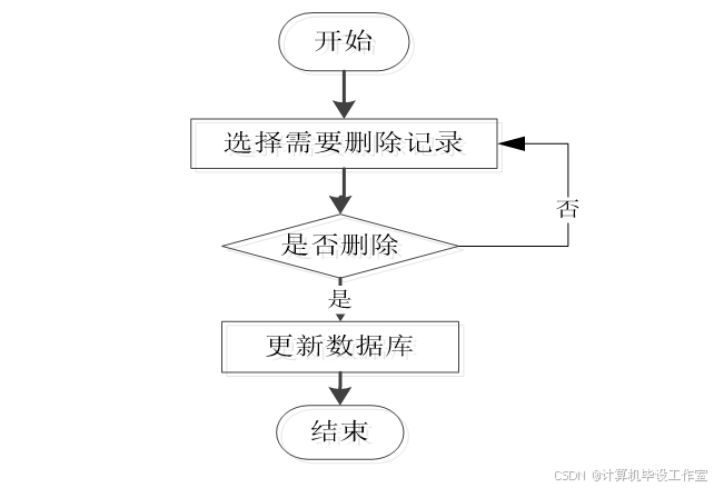 最后为删除信息页面。进入该页面后,用户可以对所要删除的信息进行选择,选择好删除的内容后,会有一个“是否确认删除”的提示框,操作者可以根据自己的意愿来选择“是”或“否”。完成上述操作,系统会自动的对删除的内容进行判断,如果符合删除要求则会成功删除数据记录,并且更新数据库的内容信息;如果删除的数据记录不符合要求,则会有一个“删除失败”的提示框,操作人员需要根据提示来进行修改,修改完成后重新删除知道删除成功。删除信息流程图如图3-3所示: