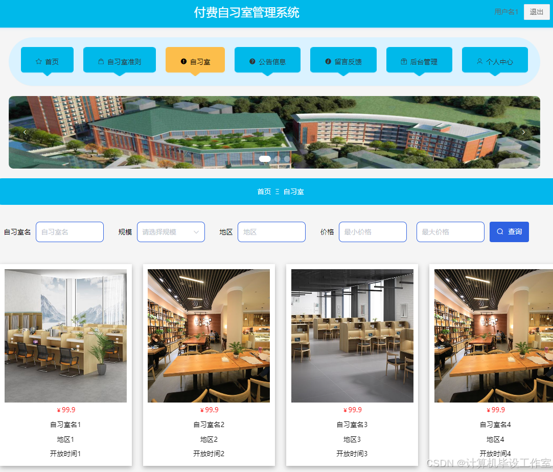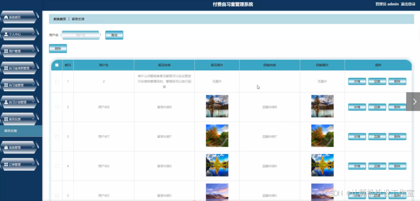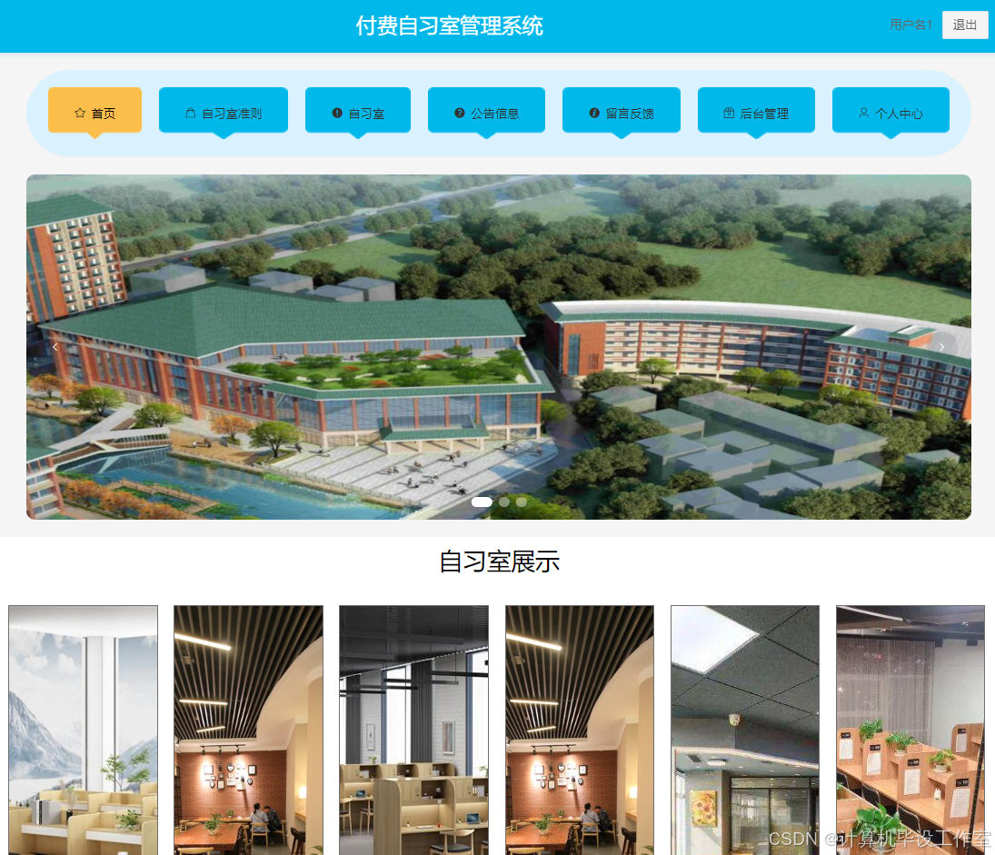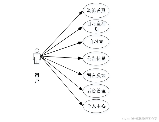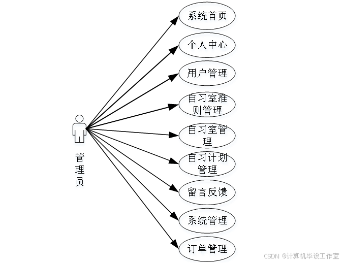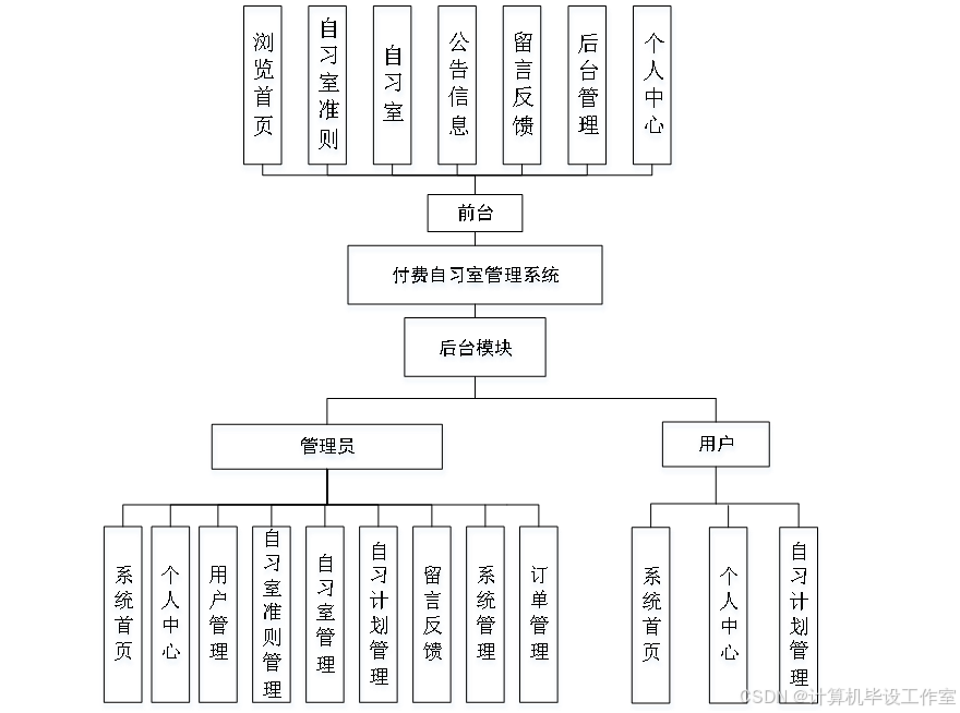 前台用户功能:浏览首页、自习室准则、自习室、公告信息、留言反馈、后台管理和个人中心。管理员的功能:系统首页、个人中心、用户管理、自习室准则管理、自习室管理、自习计划管理、留言反馈、系统管理、订单管理。