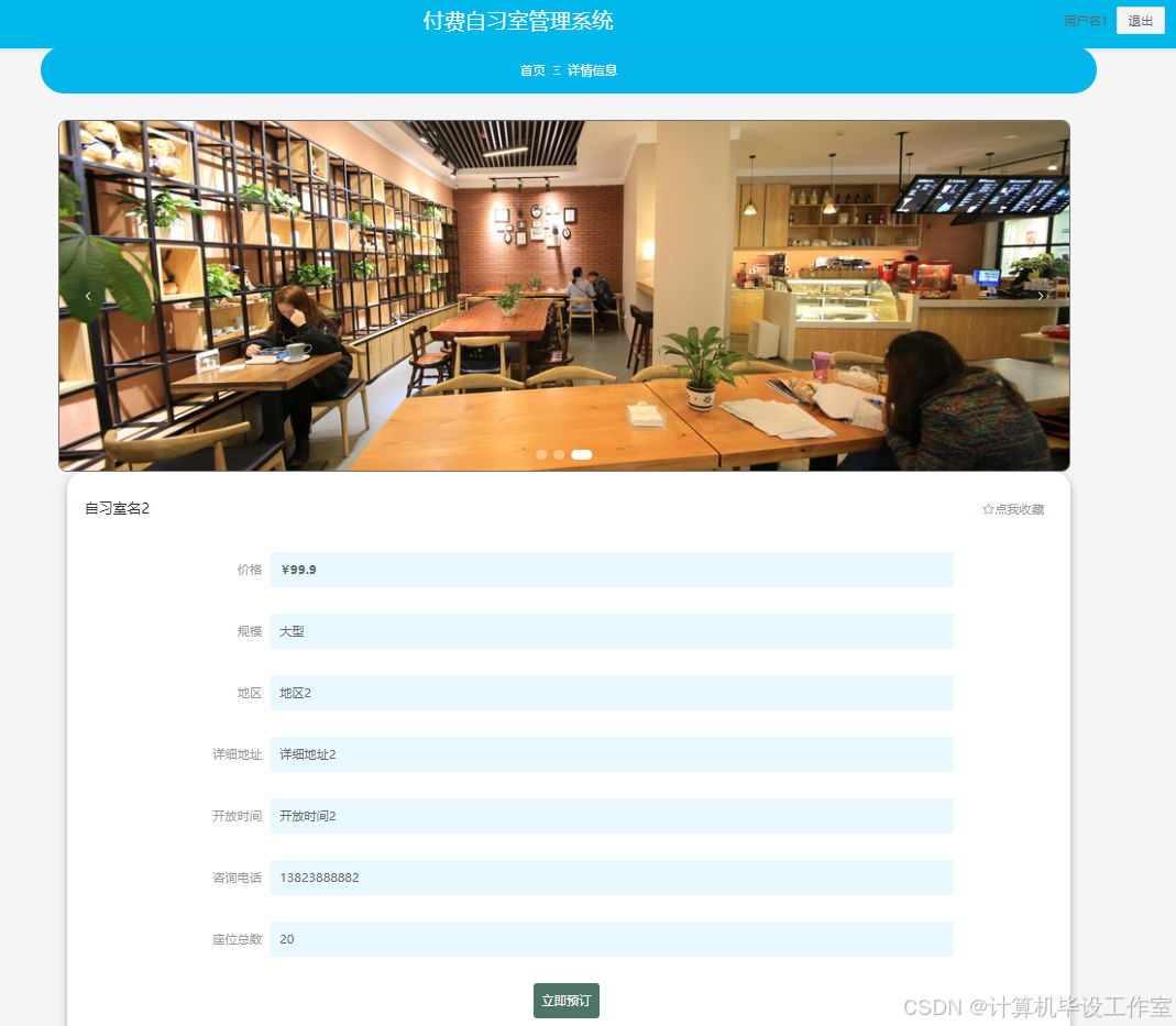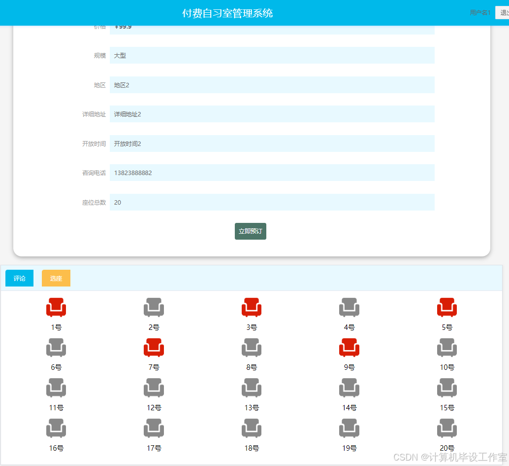 用户点击自习室,在自习室页面的输入栏中填写自习室名、规模、地区、价格,进行查询,还可以查看自习室名、图片、规模、地区、详细地址、开放时间、咨询电话、价格、座位总数等信息,进行立即预订、选座或评论等操作,如图5-5所示: