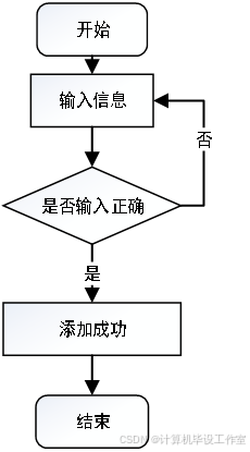 然后是添加信息的页面。进入该页面后,页面会出现一个提示框,示意操作者可以进行信息的添加,从而进行下一步的操作。用户输入想要添加的信息后提交,系统会对输入的内容进行检测。如果检测后输入的信息正确,则会出现“添加成功”的提示框,从而可以进行下一步操作;如果系统检测后检测到想要添加的信息不符合规范要求,则会提示报错,需要进行修改后重新添加。添加信息流程图如图3-2所示: