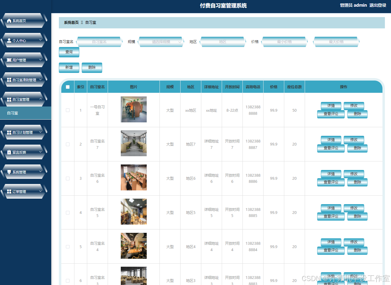 管理员点击自习室管理,在自习室管理页面中对自习室名、图片、规模、地区、详细地址、开放时间、咨询电话、价格、座位总数等信息,进行查询、新增或删除自习室信息等操作。如图5-11所示:
