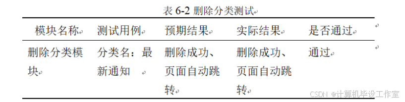 (2)删除分类测试。在删除分类模块,找到相对应的删除信息,点击“删除”该信息的接口,删除成功后信息会在数据库中的表中进行删除,然后返回前端页面删除成功的提示框。通过一次又一次的删除操作,发现该系统的删除功能以及后端代码运行正常,多次的删除测试说明该系统的删除分类功能没有问题。如表6-2所示。