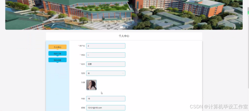 在个人中心页面可以更新个人详细信息,还可以对我的订单和我的收藏进行详细操作,如图5-6所示: