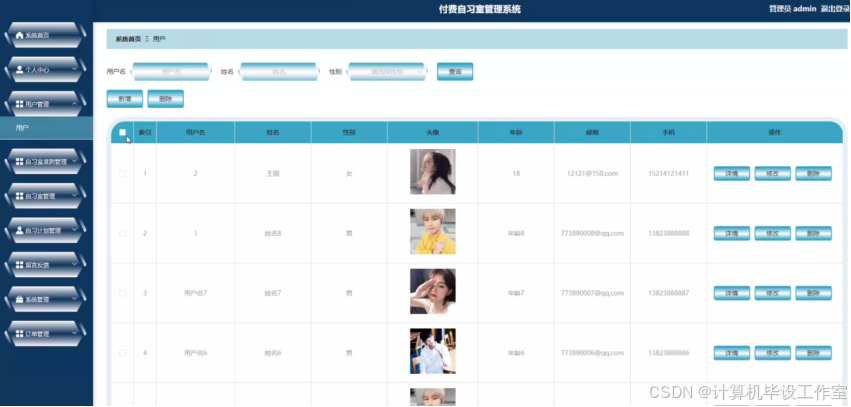 管理员点击用户管理,在用户管理页面中输入用户名、姓名、性别、头像、年龄、邮箱、手机等信息,进行查询、新增或删除用户信息等操作。如图5-9所示: