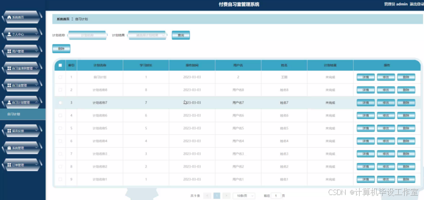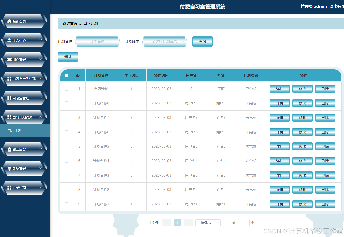 管理员点击自习计划管理,在自习计划管理页面中对计划名称、学习时长、操作时间、用户名、姓名、计划结果等信息,进行查询或删除自习计划等操作。如图5-12所示: