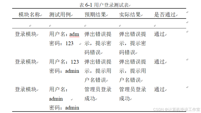 (1)用户登录测试。在登录模块页面,通过输入二个用户名和密码进行测试。其中只有但三次输入的用户名“admin”和密码“admin”是正确的,会发现第三个是登陆成功的提示信息,而第一个和第二个登录失败。第一个登录失败的原因是因为用户名和密码不匹配,数据库中无法找到相应的匹配数据;第二个登录失败的原因是因为该用户名没有注册,数据库中没有相应的记录,所以第一次和第二次的登录会出现登录失败的得结果。如表6-1所示。