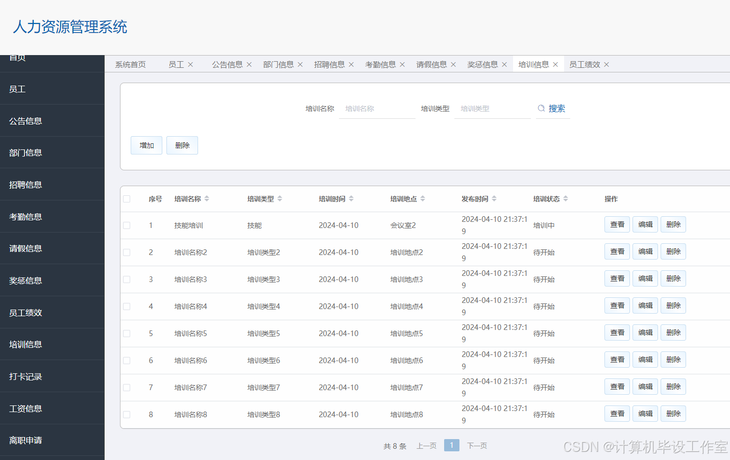 当管理员点击基于SSM人力资源管理系统中的“招聘信息”,可对招聘信息进行增加,查看,编辑和删除等操作,界面如下图所示。