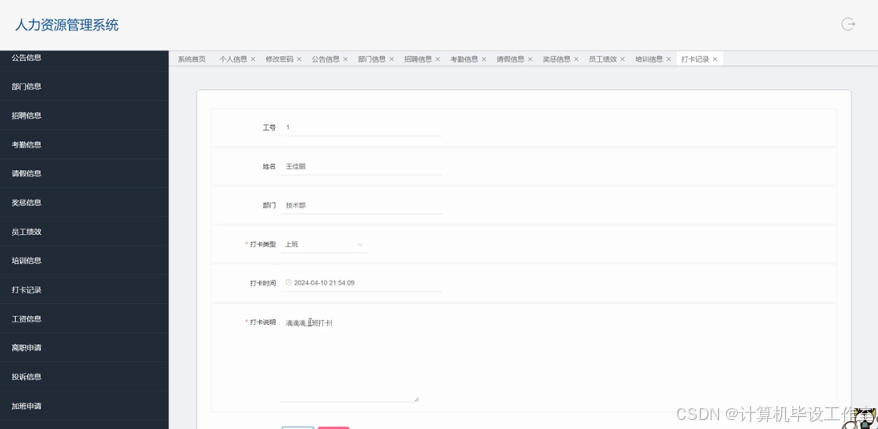 (2)管理员可以进行员工信息、部门信息、招聘信息、考勤信息、请假信息、奖惩信息、员工绩效管理、培训信息、打卡记录、工资信息、离职申请、投诉信息、加班申请、出差申请、合同信息各项功能进行管理