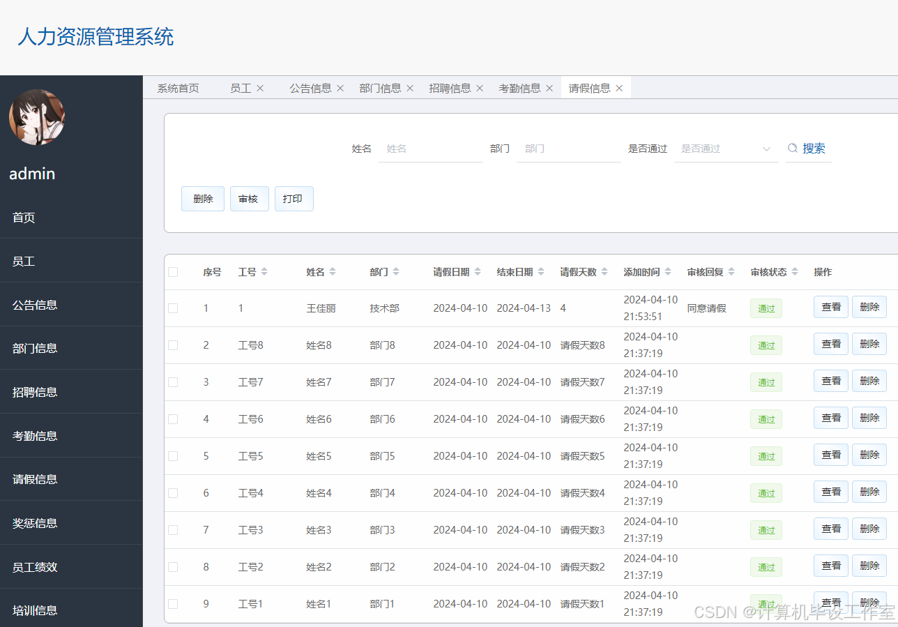 当管理员点击基于SSM人力资源管理系统中的“请假信息”,可进行查看,编辑,删除和打印,也可对员工的请假信息进行审核操作,界面如下图所示。