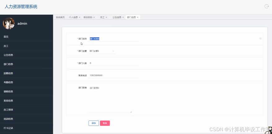 当管理员点击基于SSM人力资源管理系统中的“部门信息”,选择想要查看或新增的部门详情信息,在列表页面可以进行详情查看、删除等操作。然后点击“编辑”,填写部门名称、部门主管、部门人数、联系电话、部门职务等信息完成部门信息的编辑操作,界面如下图所示。