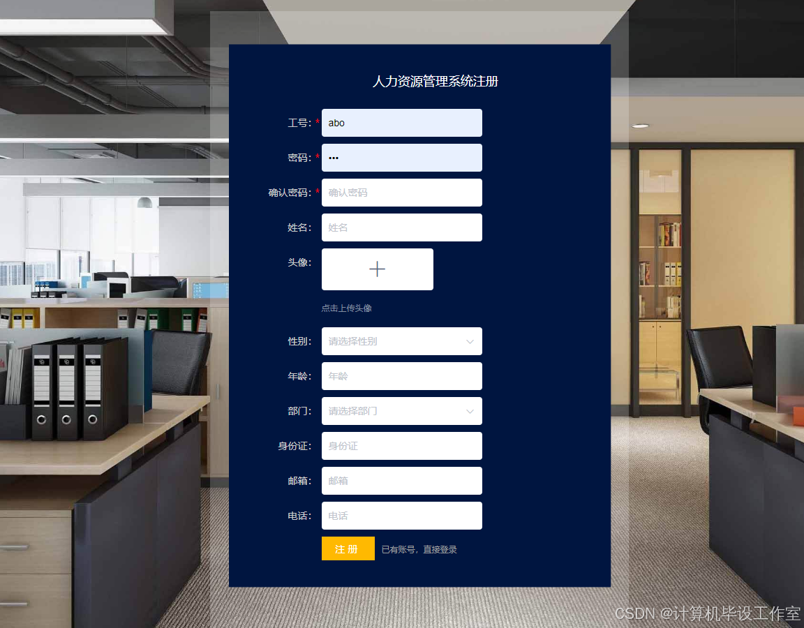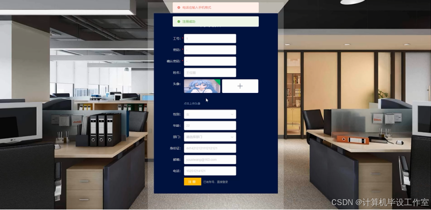 不是系统的注册用户是可以在线进行注册的,当用户点击“注册”按钮,填写上自己的工号、密码、姓名、头像、性别、年龄、部门、身份证、电话、邮箱等信息,再点击“注册”按钮后将会先验证输入的有没有空数据,再次验证密码和确认密码是否是一样的,最后验证输入的账户名和数据库表中已经注册的账户名是否重复,只有都验证没问题后即可用户注册成功。注册代码及注册界面如下所示。