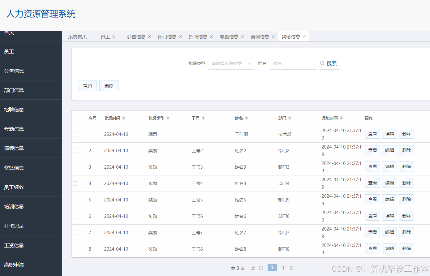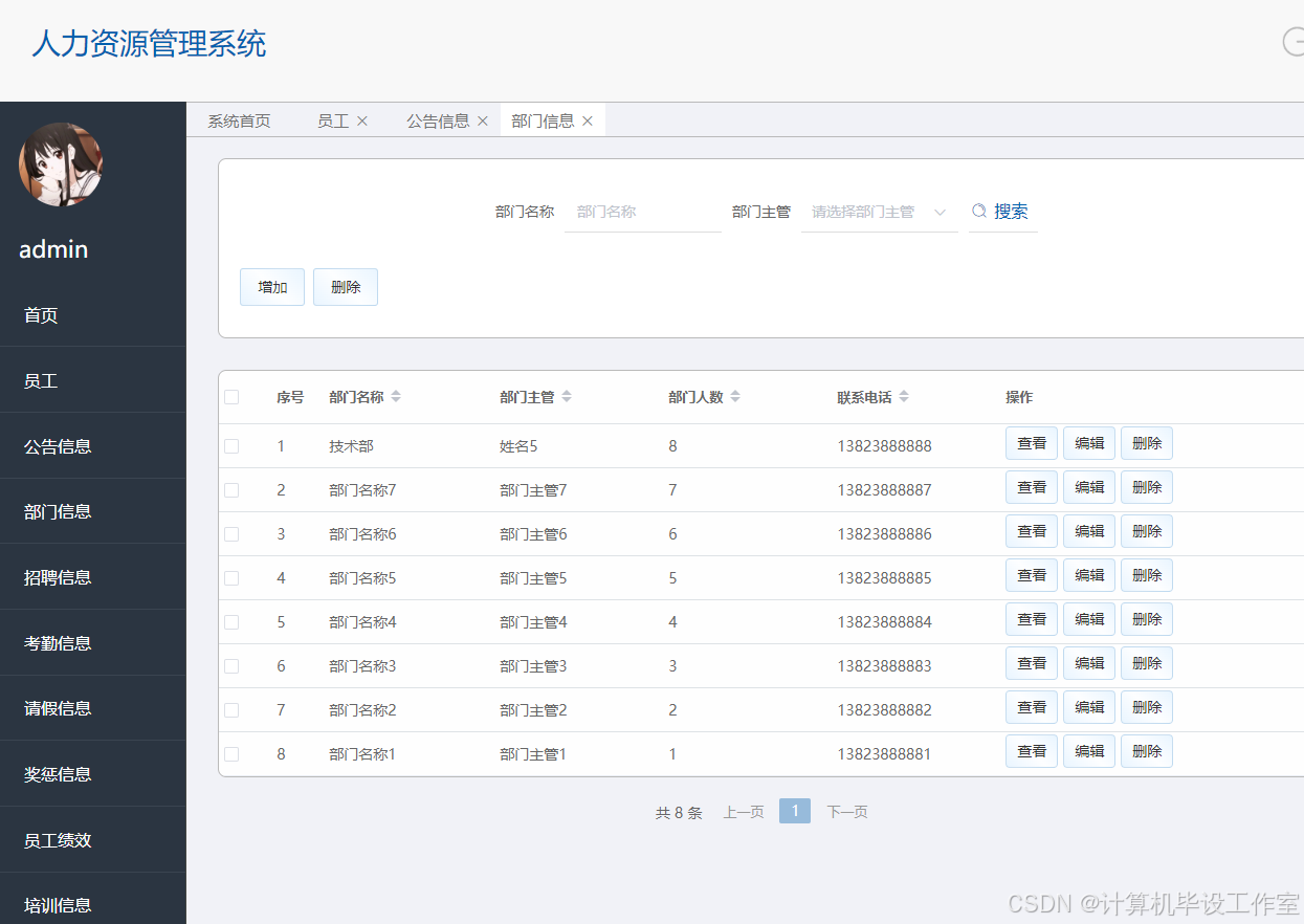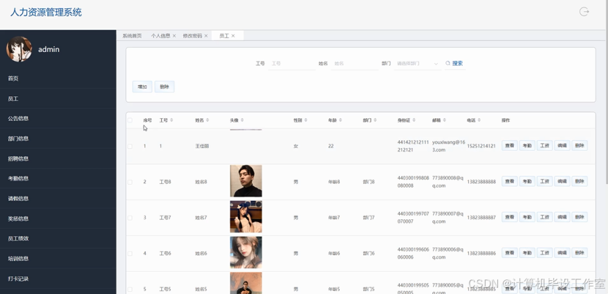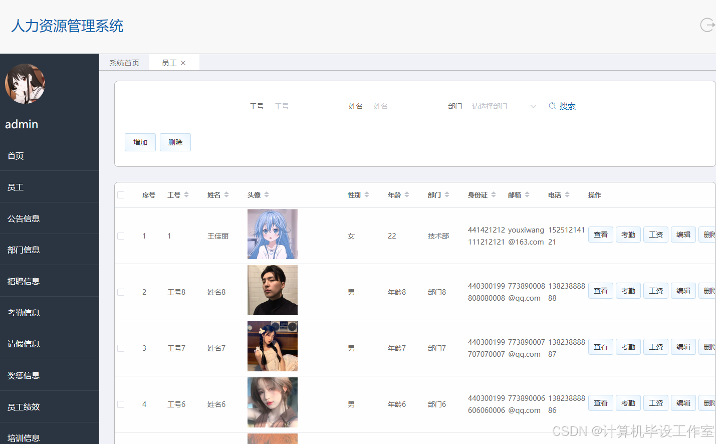 管理员拥有基于SSM人力资源管理系统的最高管理权限,管理系统的所有用户信息和权限,可通过搜索,快速找到员工的信息,进行增加、删除、编辑和查看员工信息(包括考勤状况、工资等信息)。界面如下图所示。