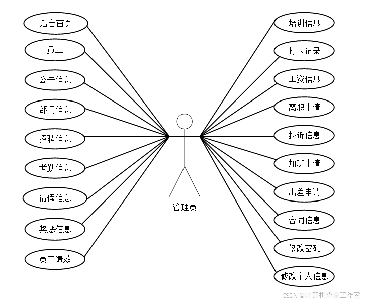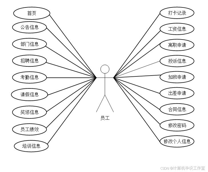 (1)员工可以进行注册登录、公告信息、招聘信息、考勤打卡、请假信息、奖惩信息、员工绩效、培训管理、工资信息、离职申请、投诉信息、加班申请、出差申请、合同信息、个人信息