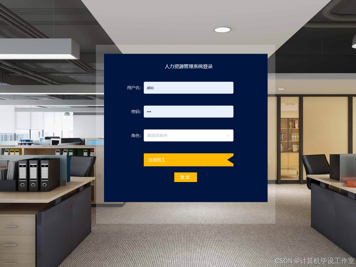基于SSM人力资源管理系统注册后的用户是可以通过自己的用户名、密码和角色进行登录的,当用户输入完整的自己的用户名、密码和角色完成验证后,点击“登录”按钮后,将会首先验证输入的有没有空数据,再次验证输入的用户名、密码和角色和数据库中当前保存的用户信息是否一致,只有在一致后将会登录成功并自动跳转到基于SSM人力资源管理系统的首页中;否则将会提示相应错误信息,用户登录界面如下图所示。