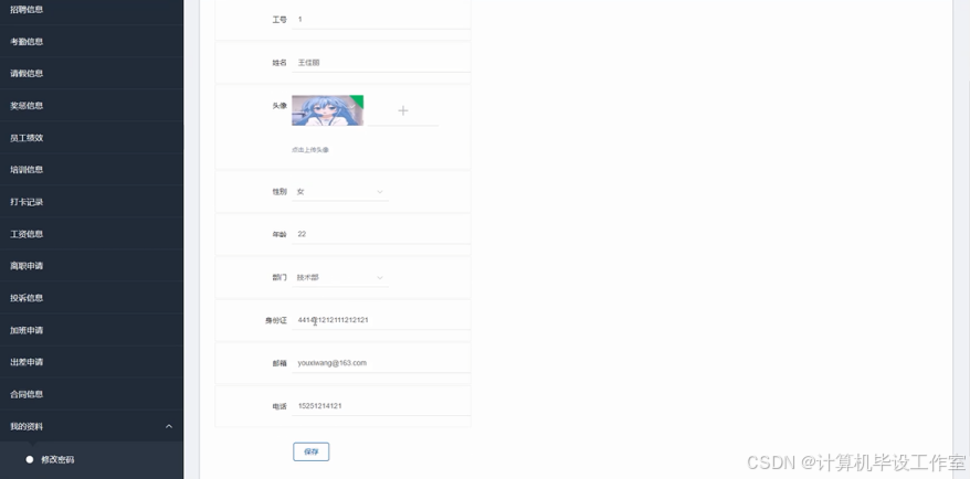 当员工用户点击基于SSM人力资源管理系统首页中的“我的资料”中可点击修改密码和个人信息进行修改操作,界面如下图所示。