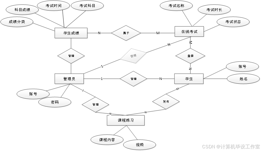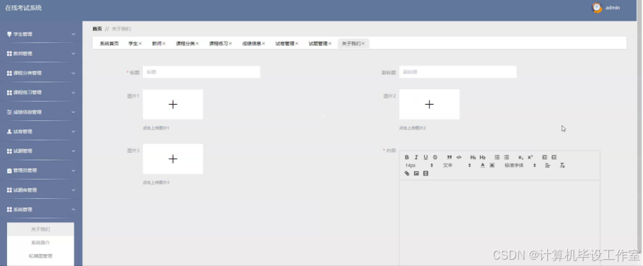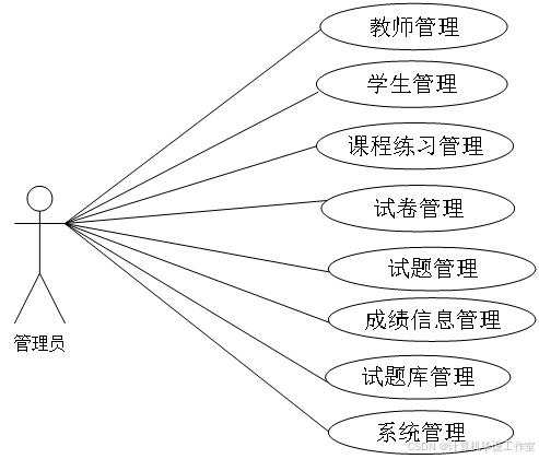 (3)管理员功能:学生管理、教师管理、课程管理、成绩管理、试卷管理、试题管理、考试管理等功能