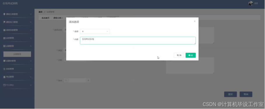 在线考试管理模块:在线考试管理分为考试添加、修改。在线考试信息由教师进行修改、添加、删除操作。