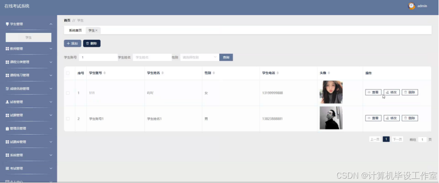 管理员在用户管理模块,可以对用户信息进行管理,用户管理模块由管理员,学生,教师组成,这里以考生用户管理为例,具体的实现界面如下图: