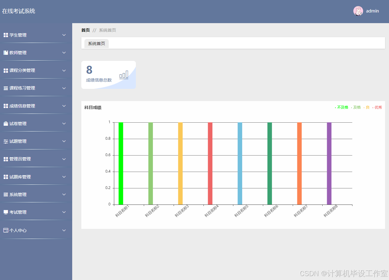 成绩管理模块:学生前台进行在线考试提交,教师进行考试成绩的审核以及发布,管理员可以对学生的成绩信息进行维护管理。