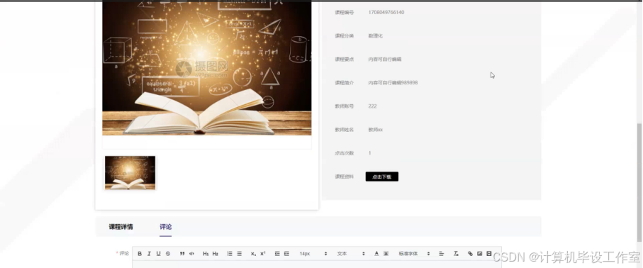 课程练习模块:教师负责上传课程练习信息包括视频信息,学生可以查看此模块信息,管理员对课程练习数据项进行维护管理。