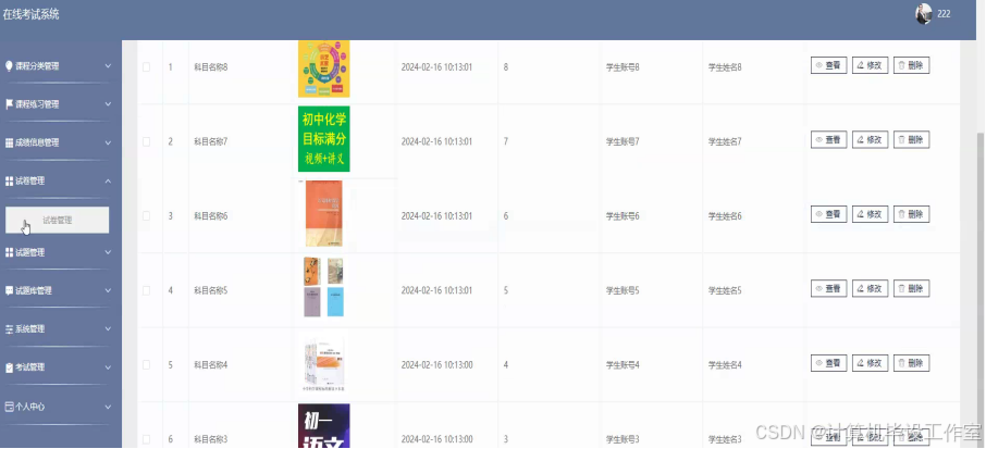 在线考试系统的研究旨在设计和开发一个基于互联网技术的在线测试平台,为教育机构提供便捷、高效的课堂测验和评估服务。该系统通过结合教育理论与技术手段,提供多种题型、自动评分和实时反馈等功能,以促进学生学习效果的提升。Springboot在线考试系统主要功能模块包括学生管理、课程练习管理、在线考试管理、考试成绩管理、试题管理等,采取面对对象的开发模式进行软件的开发和硬体的架设,能很好的满足实际使用的需求,完善了对应的软体架设以及程序编码的工作,采取MySQL作为后台数据的主要存储单元,采用Spring boot框架、JSP技术、Ajax技术进行业务系统的编码及其开发。