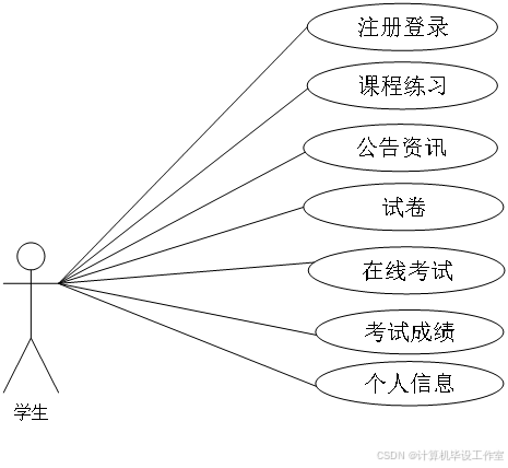 (1)学生功能:注册登录、系统首页、课程信息以及资料下载、在线考试、公告资讯、查看成绩信息、考试记录、错题本功能