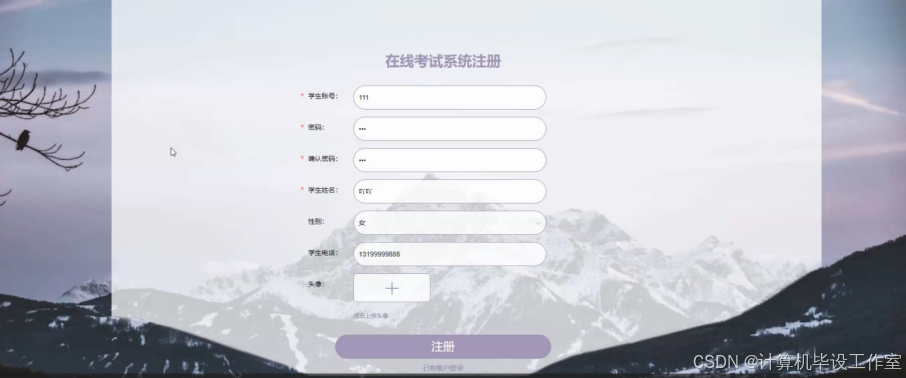 不是在线考试系统中用户的是可以在线进行注册的,当用户点击右上角的“个注册”的时候,当填写上自己的账号+密码+确认密码+昵称+邮箱+手机号+选择身份登信息后,后再点击“注册”按钮后将会先验证输入的有没有空数据,再次验证密码和确认密码是否是一样的,最后验证输入的账户名和数据库表中已经注册的账户名是否重复,只有都验证没问题后即可会员注册成功。前台注册的部分包括了用户的注册,其用注册界面展示如下图4.2所示。