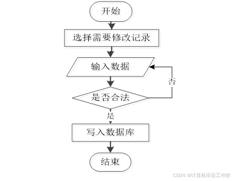 管理员可以对公告信息等进行的修改,用户可以对自己权限内的信息进行修改,首先进入修改信息界面,输入修改信息数据,系统进行数据的判断验证,修改信息合法则修改成功,信息更新至数据库,信息不合法则修改失败,重新输入。修改信息流程图如图2-5所示。