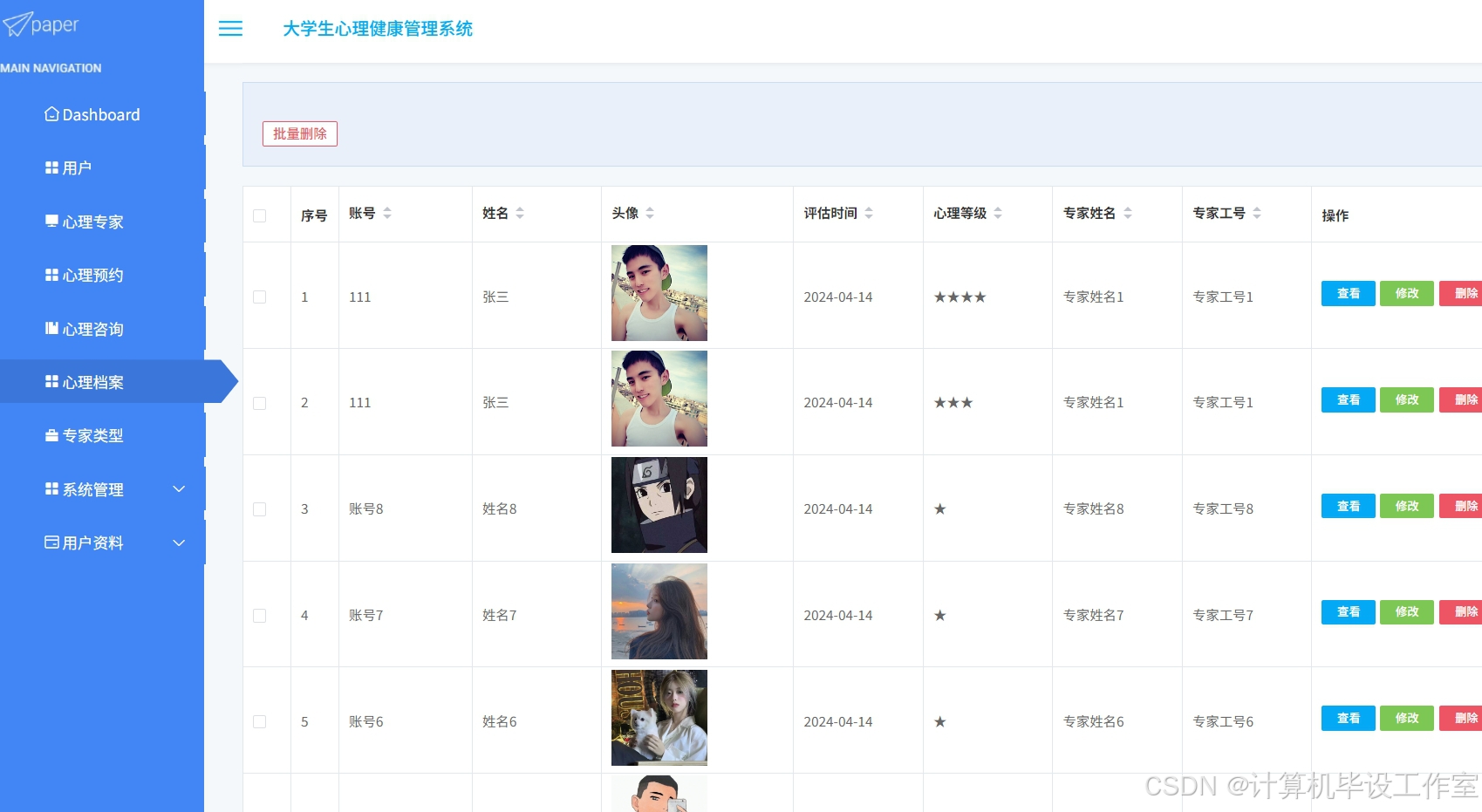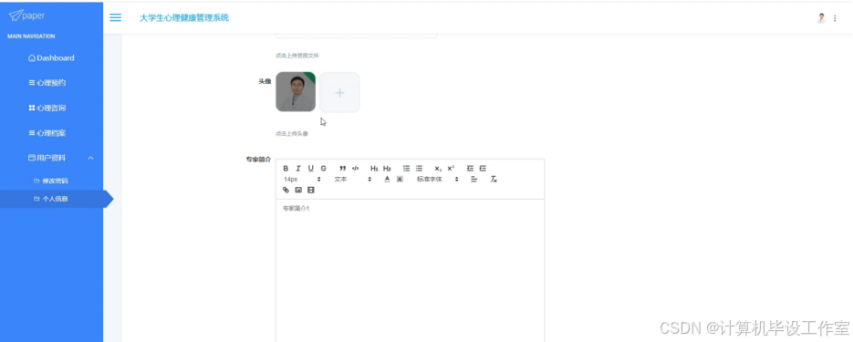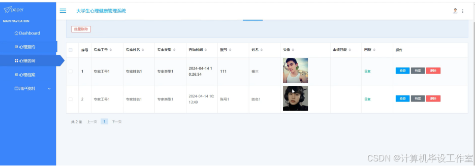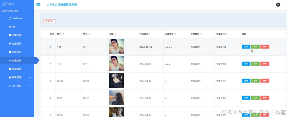 心理专家:对心理专家的个人信息和专业背景等信息进行查询、修改、添加等,让用户了解心理专家的资质和能力,以便选择合适的心理专家进行咨询。界面如下图所示。