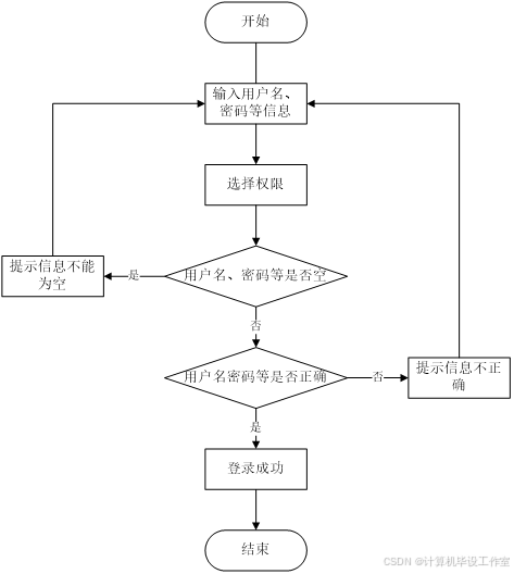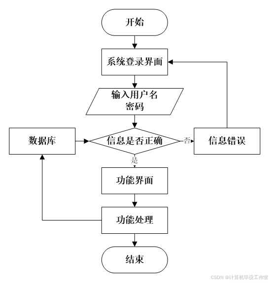 用户打开并进入系统后,会先显示登录界面,输入正确的用户名和密码,系统自动检测信息,若信息无误,则用户会进入系统功能界面,进行操作,否则会提示错误无法登录,操作流程如图2-3所示。