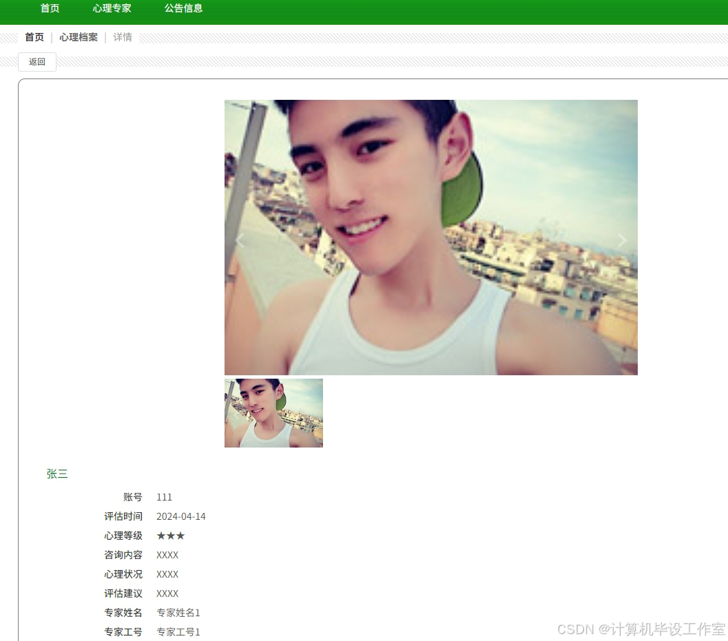用户档案:可查询每个用户的个人档案,记录用户的心理健康信息和咨询历史,方便系统进行个性化的服务和推荐。心理档案界面如下图所示。