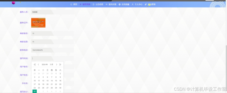 服务预约管理:查看完服务项目后可以点击服务服务预约按钮,提交预约信息