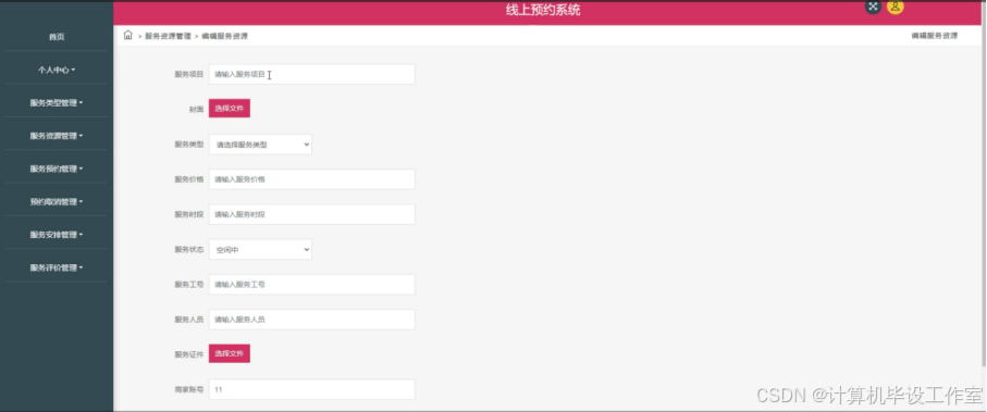 商家可以对服务资源内容进行增删改查,如新增新的服务资源需要输入服务项目、封面、服务类型、服务价格、服务时段、服务状态、服务工号、服务人员、服务证件、商家账号、商家名称、联系电话等内容进行发布。