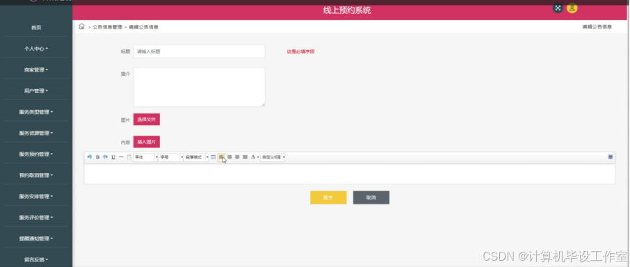 公告管理:管理者将一些需要通知用户的公告通过线上预约系统的后台执行公告发布操作,填写公告的标题、输入公告的内容、上传需要显示在公告详细页里的图片,通过线上预约系统的前台向用户展示。