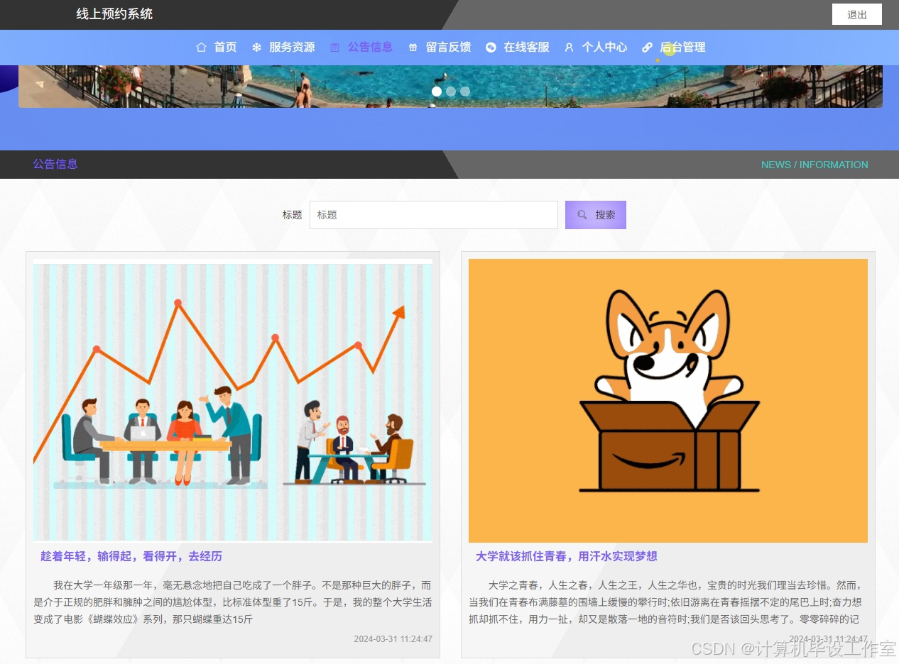 3.公告信息:公告信息是查看管理员发布的公告信息,包含有公告标题、公告类型、公告图片、发布日期。也可通过关键词语进行搜索查看。