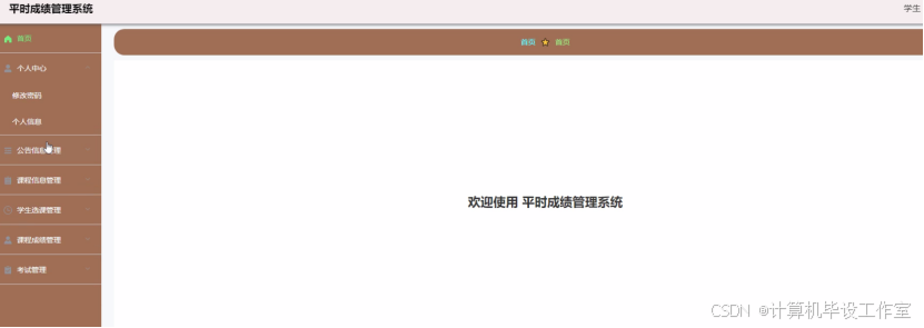 首页,在学生首页页面通过查看首页、个人中心、公告信息管理、课程信息管理、学生选课管理、课程成绩管理、考试管理,如图5-9所示。