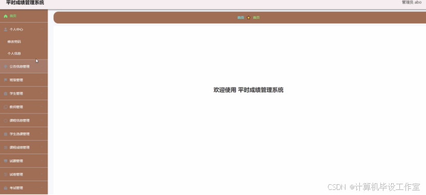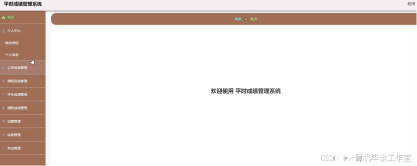 首页,管理员登录进入平时成绩管理系统后台可以查看首页、个人中心、公告信息管理、班级管理、学生管理、教师管理、课程信息管理、学生选课管理、课程成绩管理、试题管理、试卷管理、考试管理等内容,如图5-2所示。