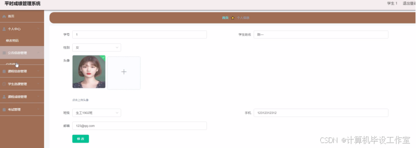 个人信息,在学生个人信息页面可以查看编辑学号 、学生姓名、性别、头像、班级、手机、邮箱等内容,进行修改操作,如图5-10所示。