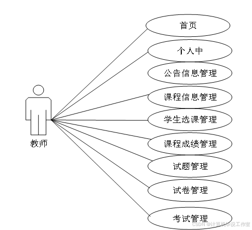 教师后台;首页、个人中心、公告信息管理、课程信息管理、学生选课管理、课程成绩管理、试题管理、试卷管理、考试管理,结构图,如图4-4所示:
