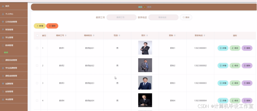 教师管理,管理员在教师管理页面可以查看教师工号、教师姓名、性别、照片、职称、联系电话等内容,并可根据需要对教师管理进行详情,修改或删除等操作,如图5-5所示。