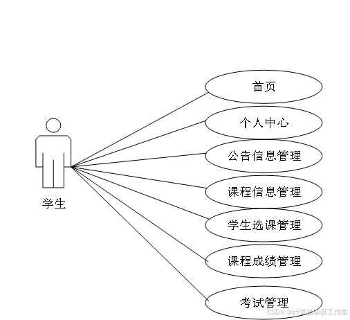 学生后台;首页、个人中心、公告信息管理、课程信息管理、学生选课管理、课程成绩管理、考试管理,结构图,如图4-5所示: