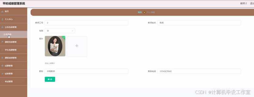 个人信息,在教师个人信息页面可以查看编辑教师工号、教师姓名、性别、照片、职称、联系电话等内容,进行修改操作,如图5-15所示。