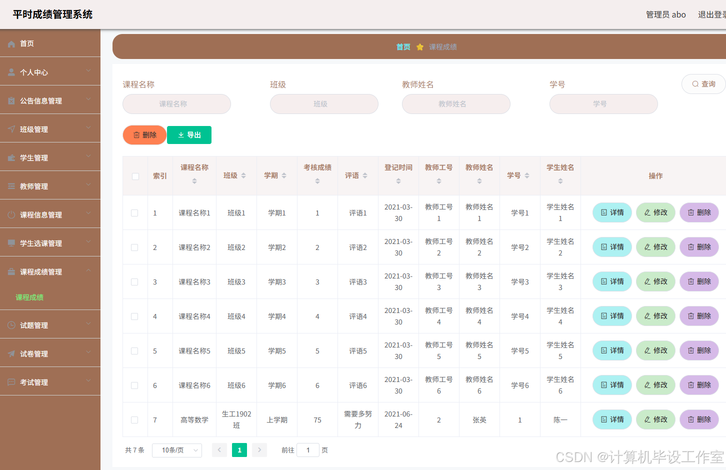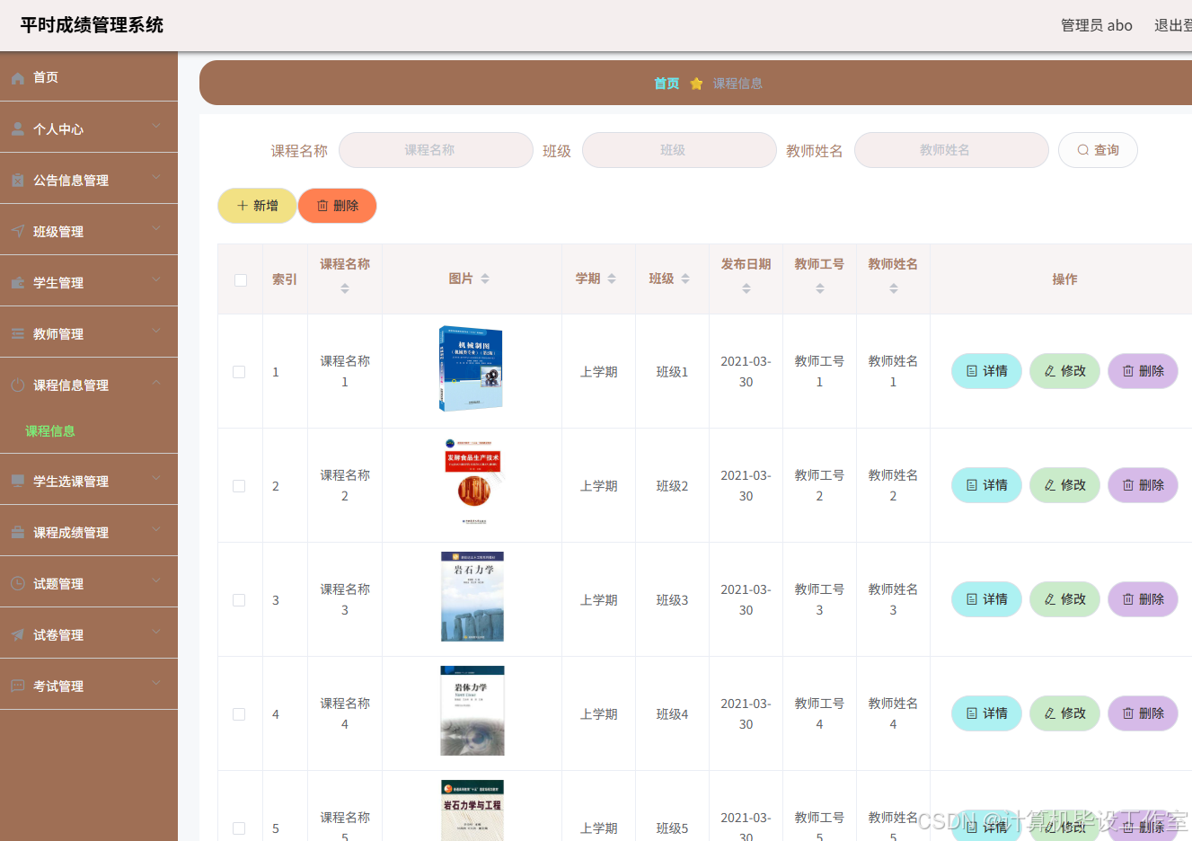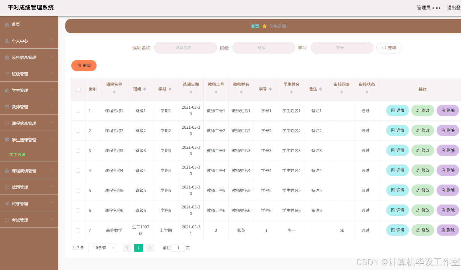 平时成绩管理系统,主要的模块包括管理员;首页、个人中心、公告信息管理、班级管理、学生管理、教师管理、课程信息管理、学生选课管理、课程成绩管理、试题管理、试卷管理、考试管理,学生;首页、个人中心、公告信息管理、课程信息管理、学生选课管理、课程成绩管理、考试管理;教师;首页、个人中心、公告信息管理、课程信息管理、学生选课管理、课程成绩管理、试题管理、试卷管理、考试管理等功能。系统中管理员主要是为了安全有效地存储和管理各类信息,还可以对系统进行管理与更新维护等操作,并且对后台有相应的操作权限。