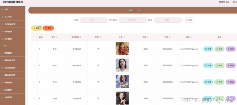 学生管理,管理员在学生管理页面可以查看学号、学生姓名、性别、头像、班级、手机、邮箱等内容,并可根据需要对学生管理进行详情,修改或删除等操作,如图5-4所示。