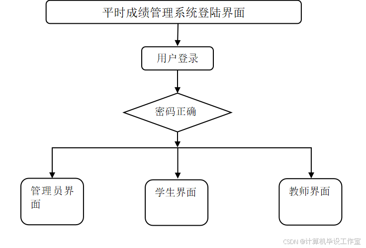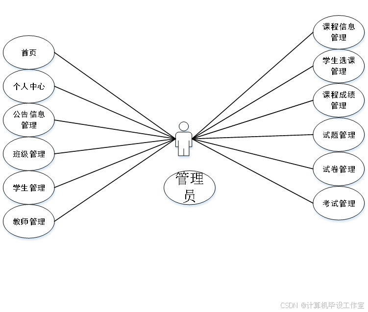 管理员:首页、个人中心、公告信息管理、班级管理、学生管理、教师管理、课程信息管理、学生选课管理、课程成绩管理、试题管理、试卷管理、考试管理,功能结构图,如图4-3所示: