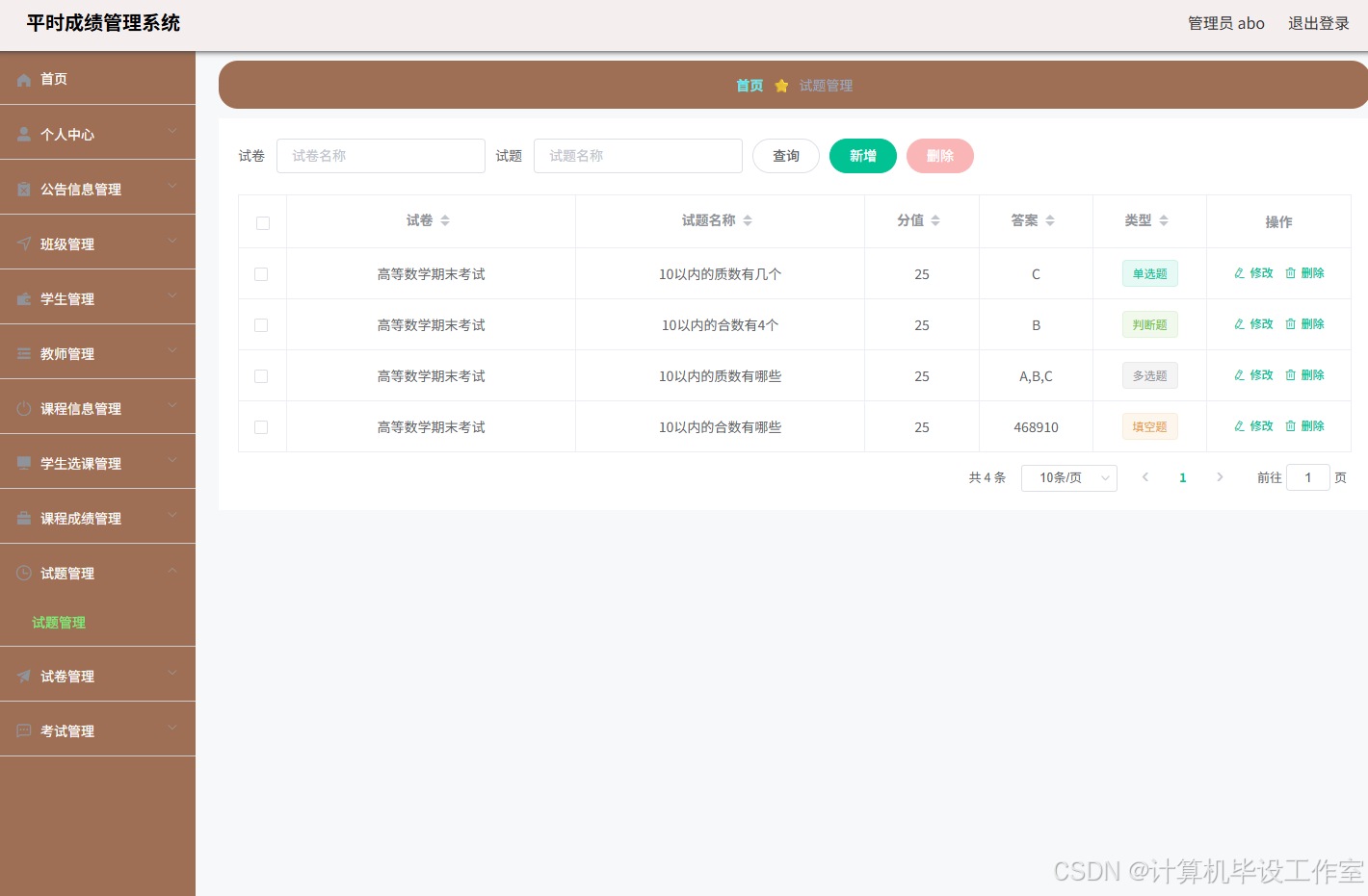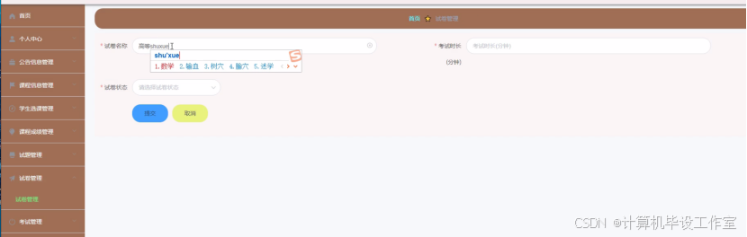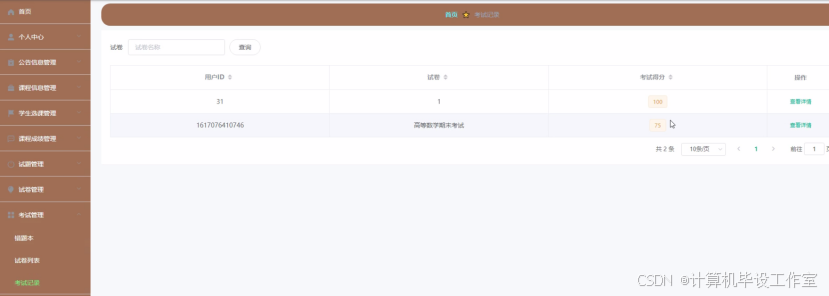 (3)管理员功能:个人中心、公告信息管理、班级管理、学生管理、教师管理、课程信息管理、学生选课管理、课程成绩管理、试题管理、试卷管理、考试管理