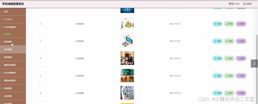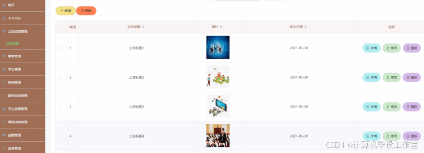 公告信息管理,管理员在公告信息管理页面可以查看公告标题、图片、发布日期 、发布内容等内容,并可根据需要对公告信息进行详情,修改或删除等操作,如图5-3所示。