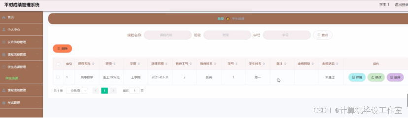 学生选课管理,学生在选课页面可以查看管理员审核回复,并可根据需要对详情查看、修改、删除操作,如图5-11所示。