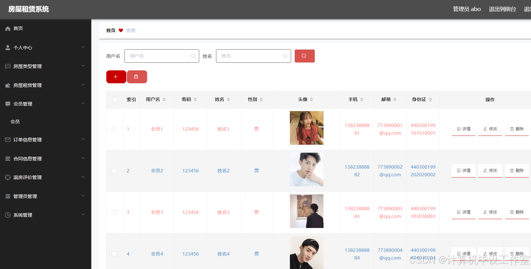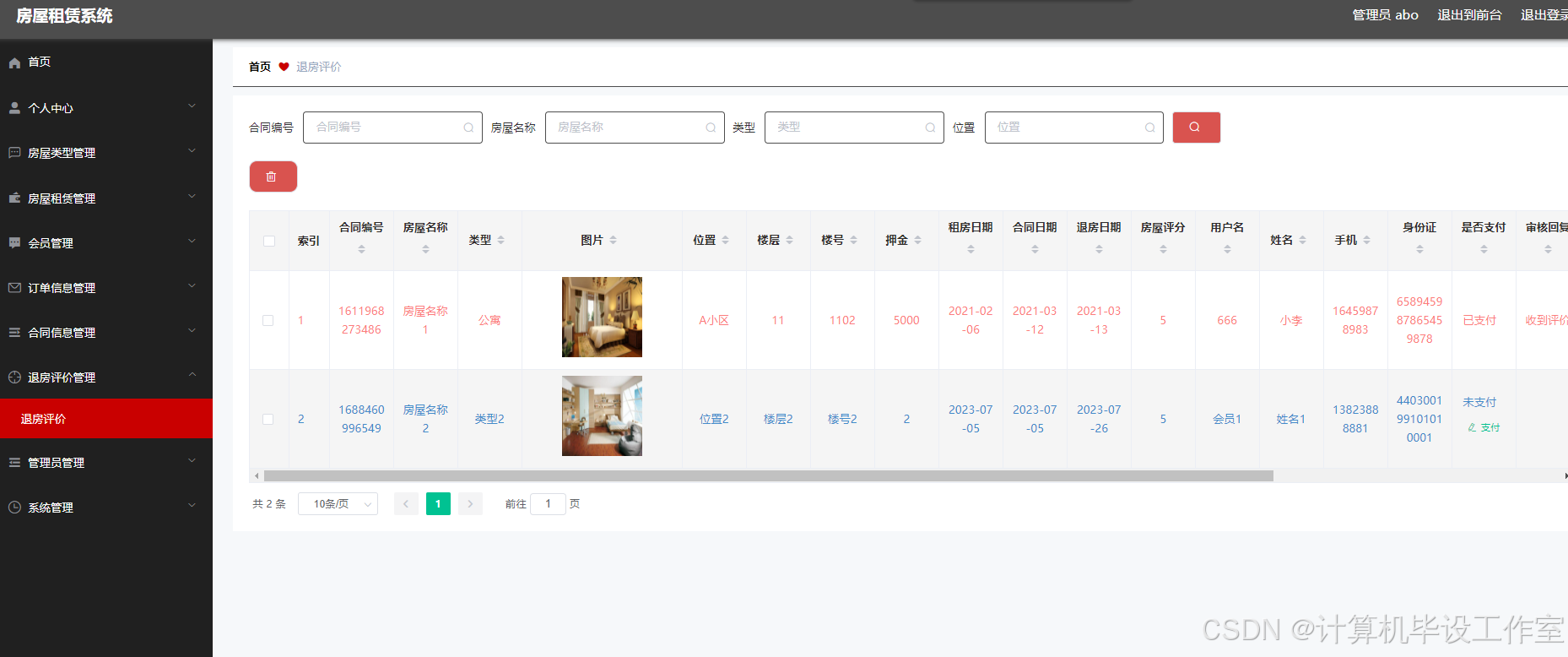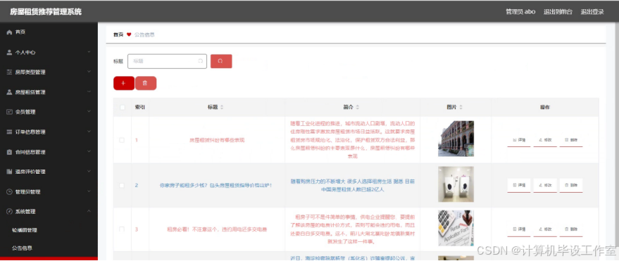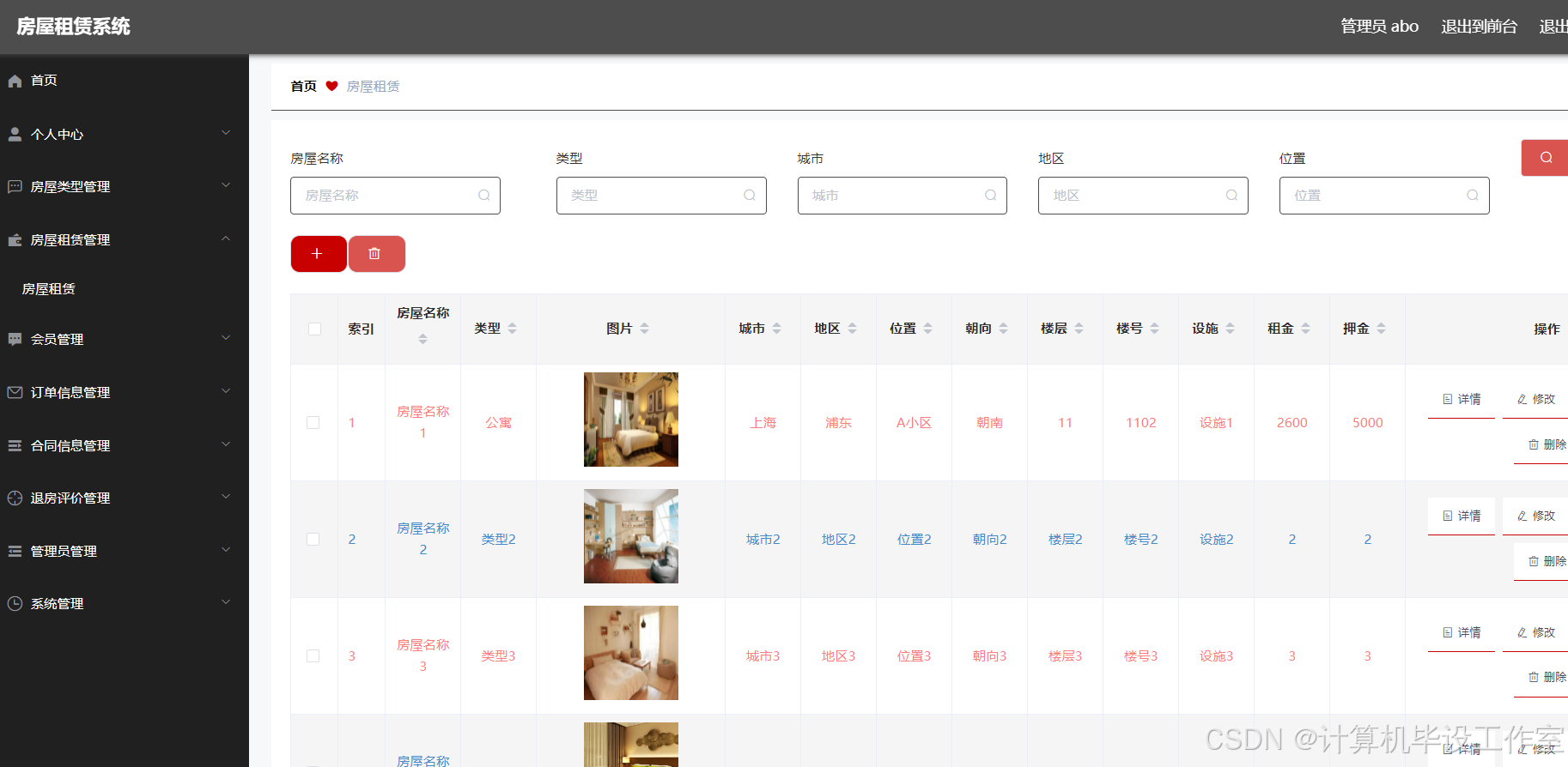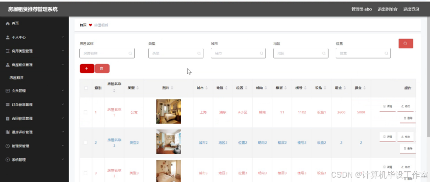 c)房屋租赁管理:管理员可以查看和管理所有的租赁房屋信息。